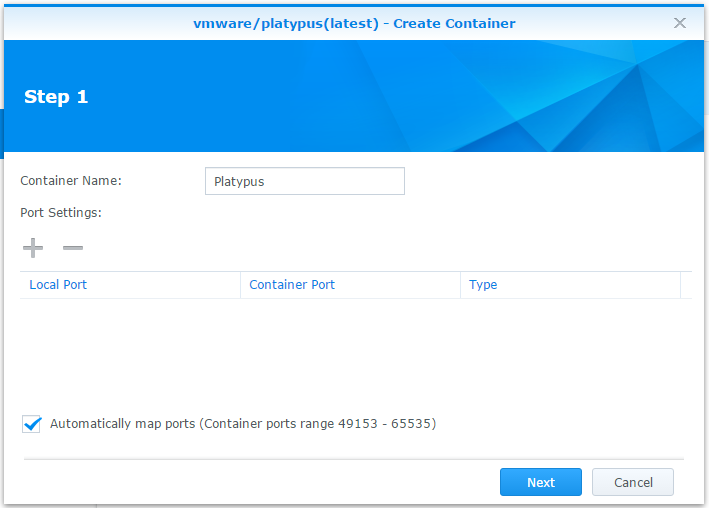 At Step 1, enter a friendly name for the container into the **Container Name **field (as you can see I gave it alot of deep thought and chose Platypus). Select whether or not you wish to specify a static Local Port and Container Port or whether you want to use automatic port allocation (by clicking the checkbox), then click Next