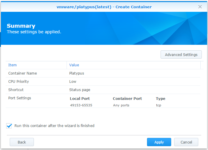 At Summary, review the choices that have been made, select the Run this container after the wizard has finished checkbox and click Apply