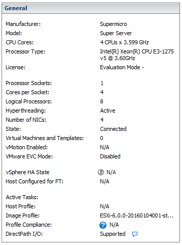 Having put it all together, it seems VMware ESXi 6.0 recognises all of the components and I look forward to adding another host in a week or so to complete my two node cluster setup!