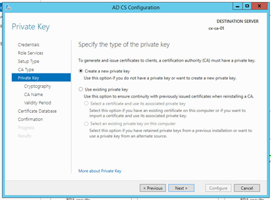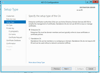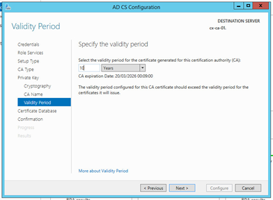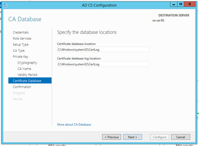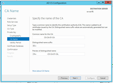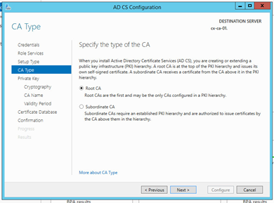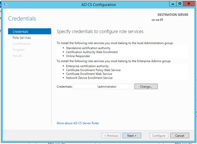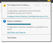 Click Configure Active Directory Certificate Services to run the AD CS Configuration Post-deployment configuration wizard.