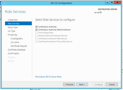 Check the Certification Authority and Certification Authority Web Enrollment checkboxes and click Next.
