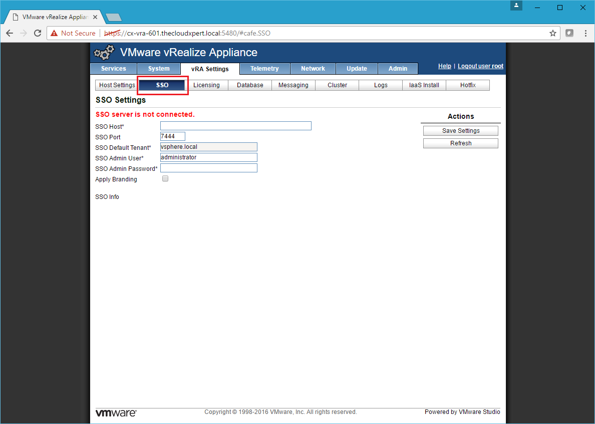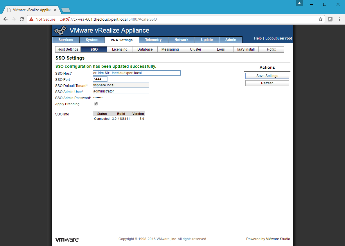 1. Enter the FQDN of the previously deployed Identity Appliance into the SSO Host text box, leave the value in the SSO Port text box as the default 7444, enter the SSO administrator password into the SSO Admin Password text box and then check the Apply Branding checkbox. Then click Save Settings.