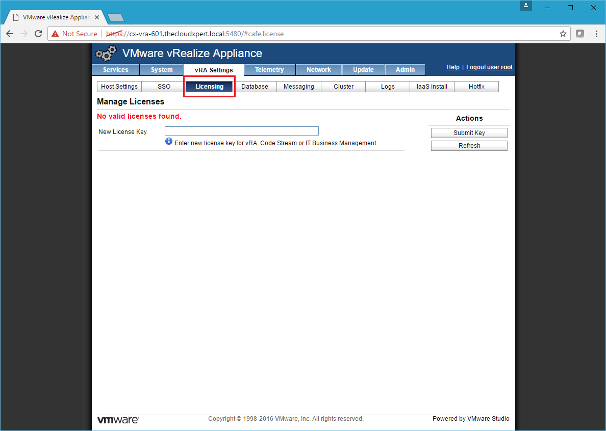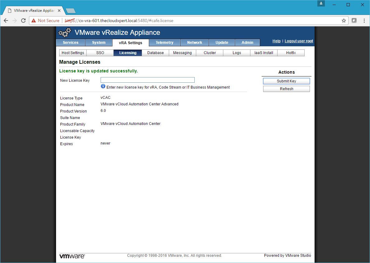 1. Enter the vRealize Automation 6 key into the New License Key text box, then click Submit Key.