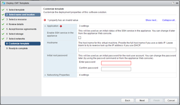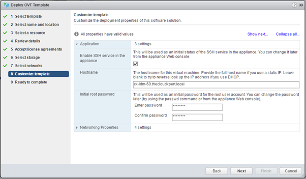 - Check the Enable SSH service in the appliance checkbox (this can be disabled later), enter the FQDN of the Identity Appliance into the Hostname text field and enter (then confirm) the root password in the Enter password and Confirm password text fields.