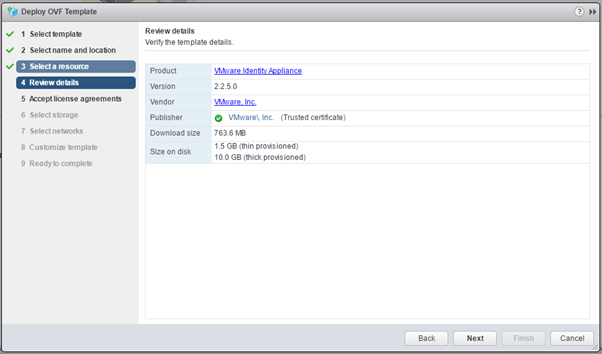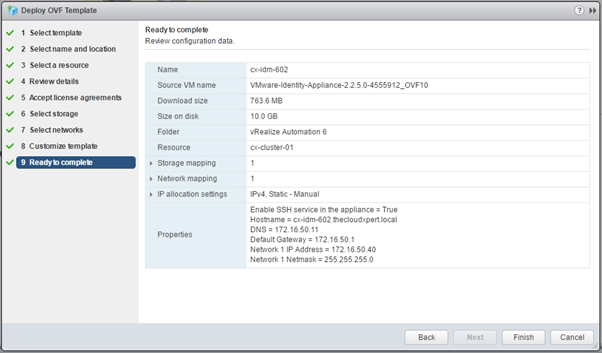- Review the configuration information and then Click Finish to deploy the Identity Appliance.