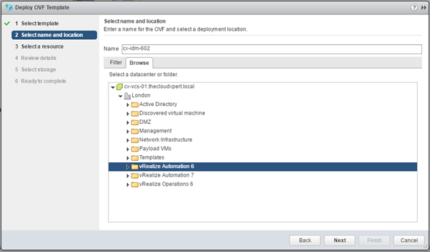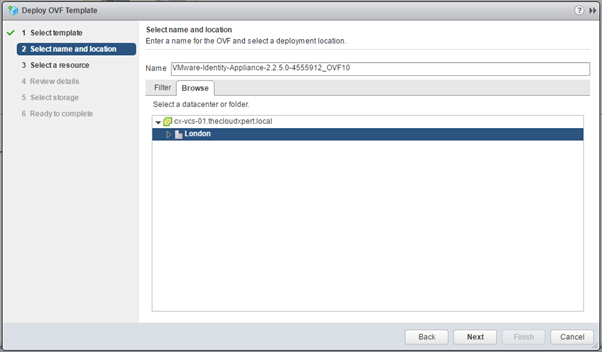 - Enter the Identity Appliance name into the the Name text field and then select the Datacentre or folder location to deploy the Identity Appliance.