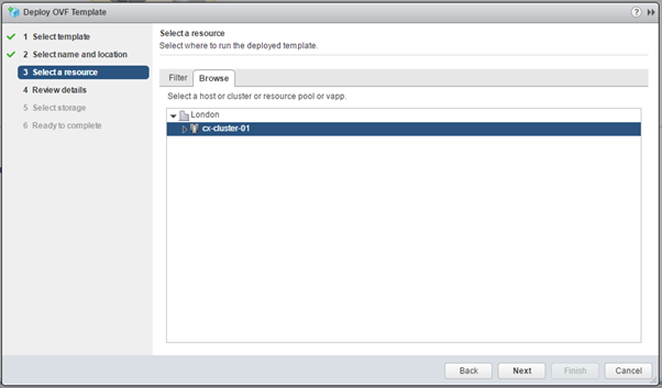 - Select the appropriate cluster, host or resource pool and then click Next.