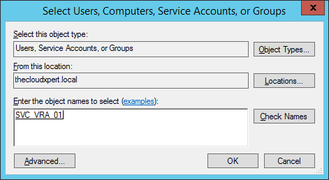 - Type in the VRA Service account name, click Check Names and then click OK.