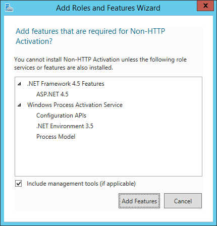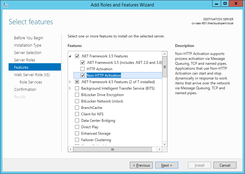 - Expand .NET Framework 3.5 Features and check both the NET Framework 3.5 (includes .NET 2.0 and 3.0) checkbox and Non-HTTP Activation checkbox.