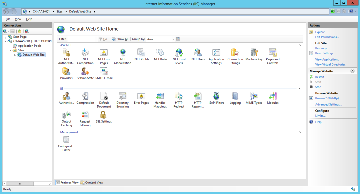 - At the Internet Infomation Services (IIS) Manager, right-click on the Default Web Site and select Manage Website > Restart.