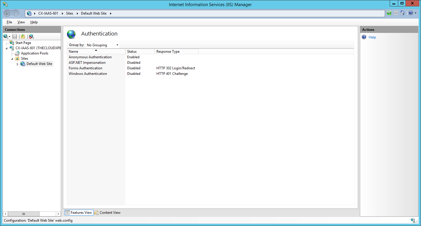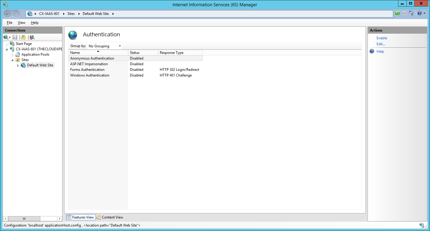 - Under Authentication highlight Anonymous Authentication and click Disable from the Actions menu.