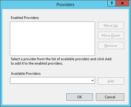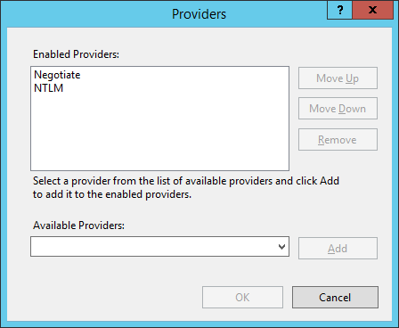 - Under Authentication highlight Windows Authentication and click Providers from the Actions menu.