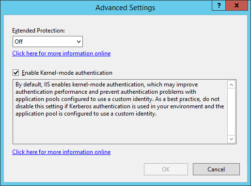 - Select Off from the Extended Protection dropdown, check the Enable Kernel-mode authentication checkbox and then click OK.