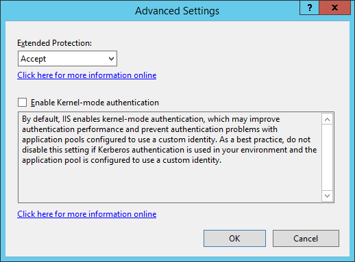 - Select Accept from the Extended Protection dropdown, uncheck the Enable Kernel-mode authentication checkbox and then click OK.
