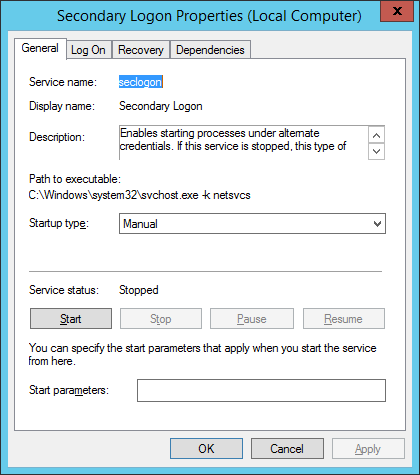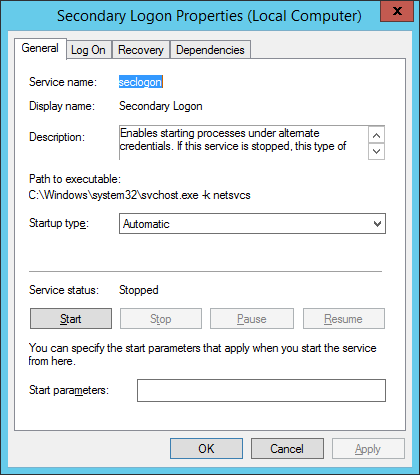 - Locate the Secondary Logon Service, right-click and select Properties.