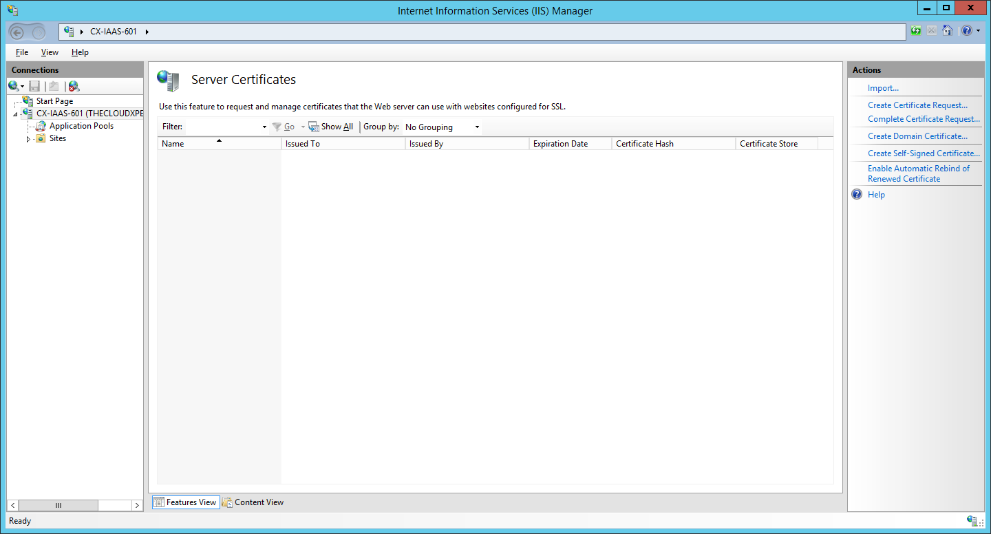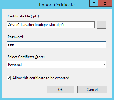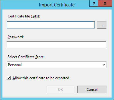 - Enter the location of the pfx version of the SSL certificate for this server into the Certificate file (.pfx) text box (you can click … and search for it), type the export password into the Password textbox.