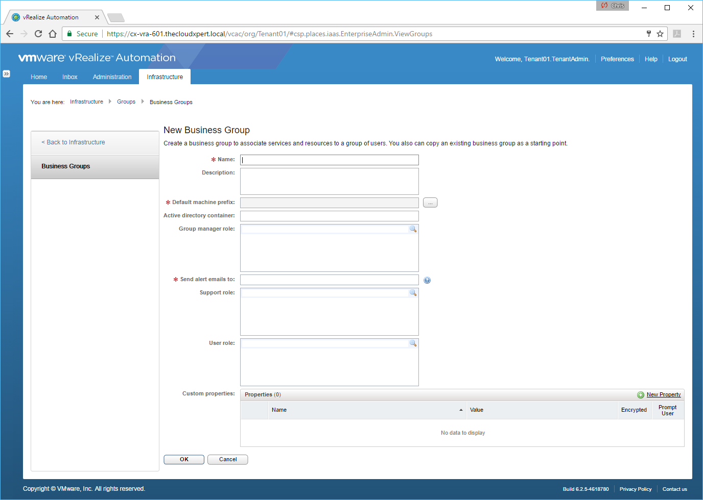 To modify an existing Business Group, you must be a Tenant Administrator or a Business Group Manager (assuming the Business Group Manager role has been assigned to the Business Group).