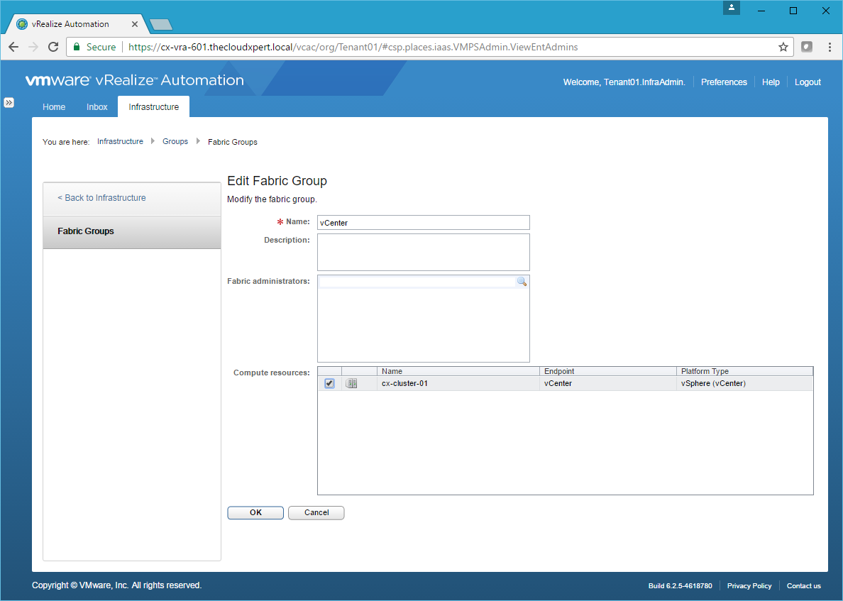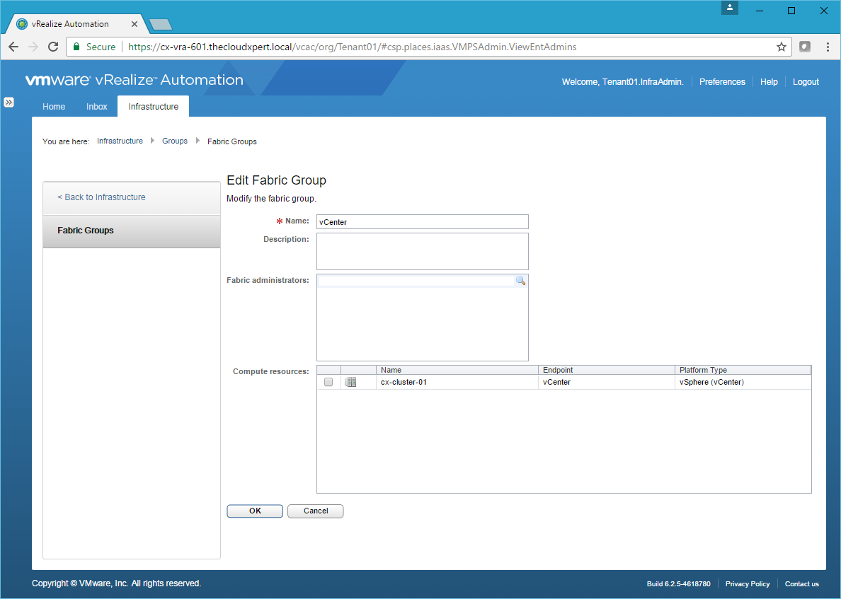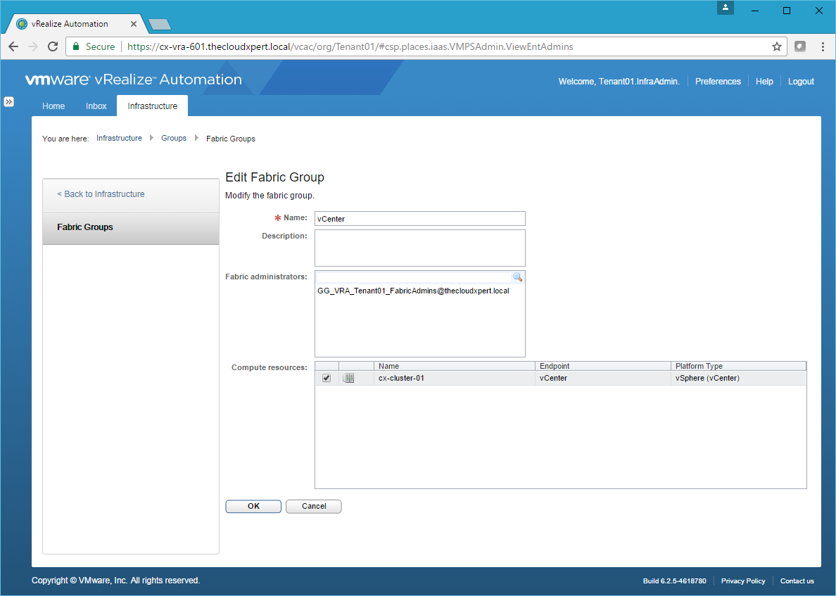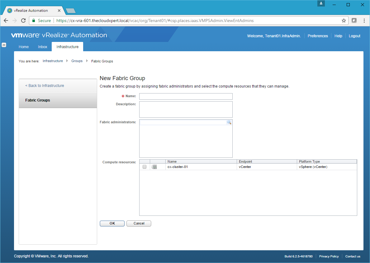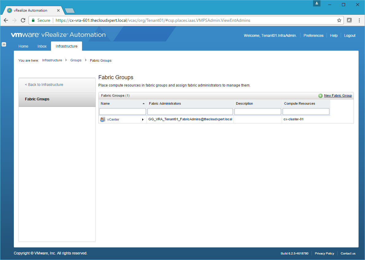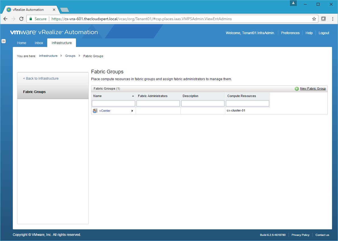 The creation of a Fabric Group is the responsibility of the Infrastructure Administrator role. The Fabric Group can be created within either the Default Tenant or in a specific Customer Tenants. As part of the creation of a Fabric Group, the Fabric Administrator role is assigned and it is there job to manage the Compute Resources in a Fabric.