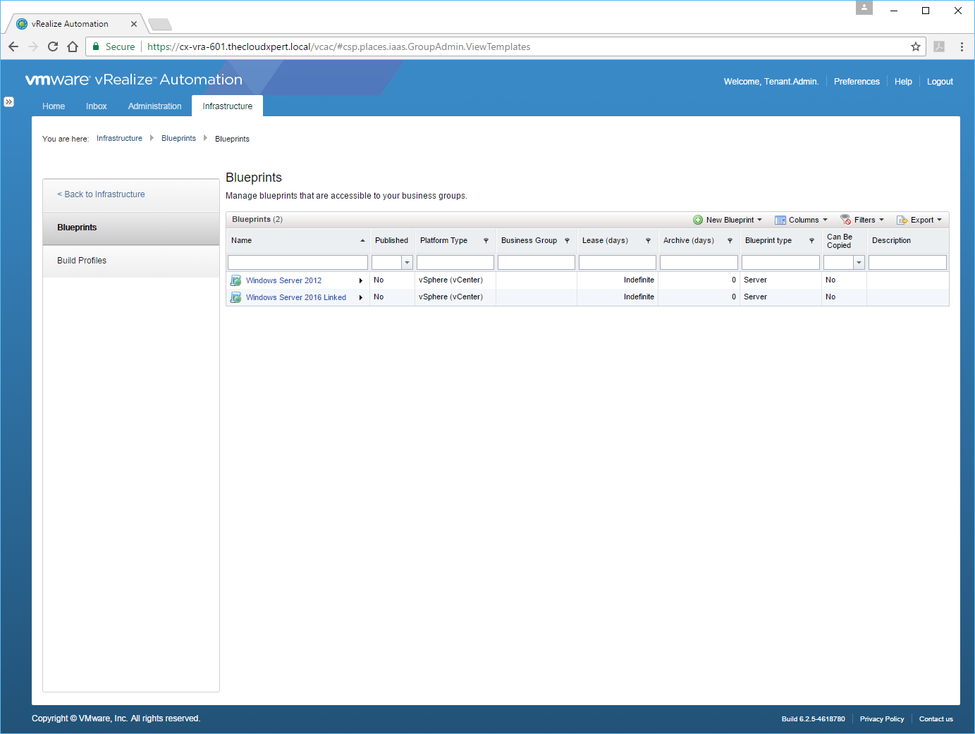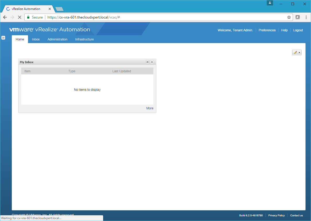 - Navigate to the vRealize Automation Portal for the Default Tenant ( https://vra.fqdn/vcac )