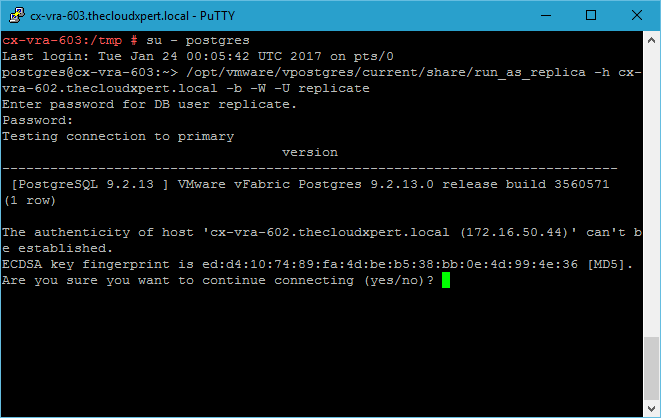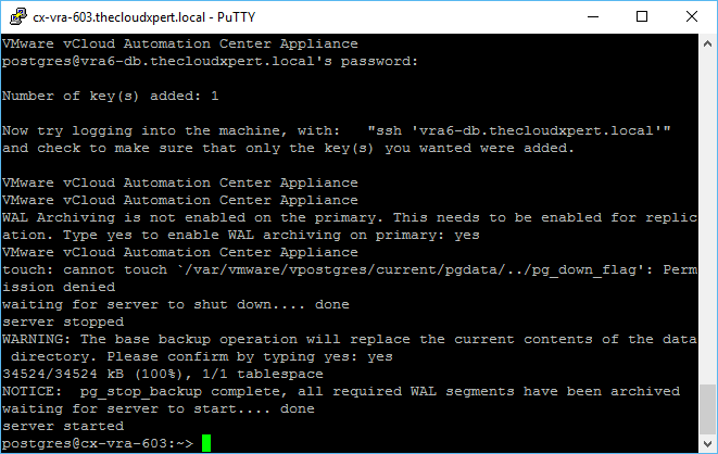 /opt/vmware/vpostgres/current/share/run_as_replica -h <VRA FQDN> -b -W -U replicate