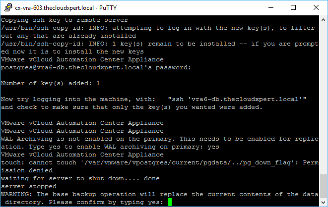 ./pgClusterSetup.sh -d <VRA DB FQDN> -w <VRA DB PASSWORD> -r <VRA REPL PASSWORD> -p <VRA POSTGRES PASSWORD>
