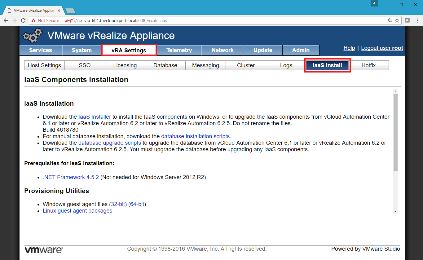 The IaaS Installer ( setup__vra-appliance.fqdn@5480.exe ) file is used to install and configure the IaaS components. There are two ways to download / obtain the IaaS Software from the vRealize Automation Appliance: