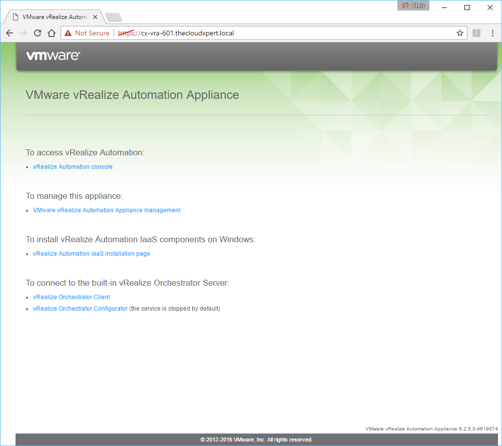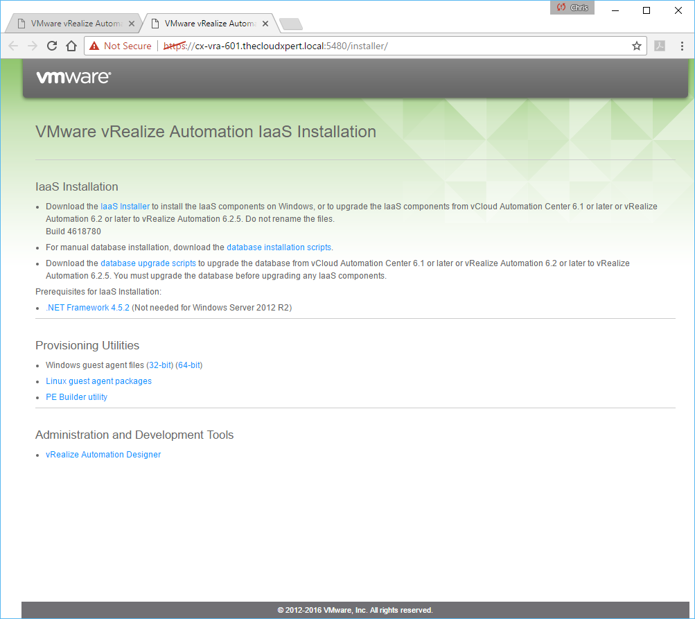 - Click the vRealize Automation IaaS installation page link (accept any certificate warnings on the website if you haven’t changed the certificates yet).
