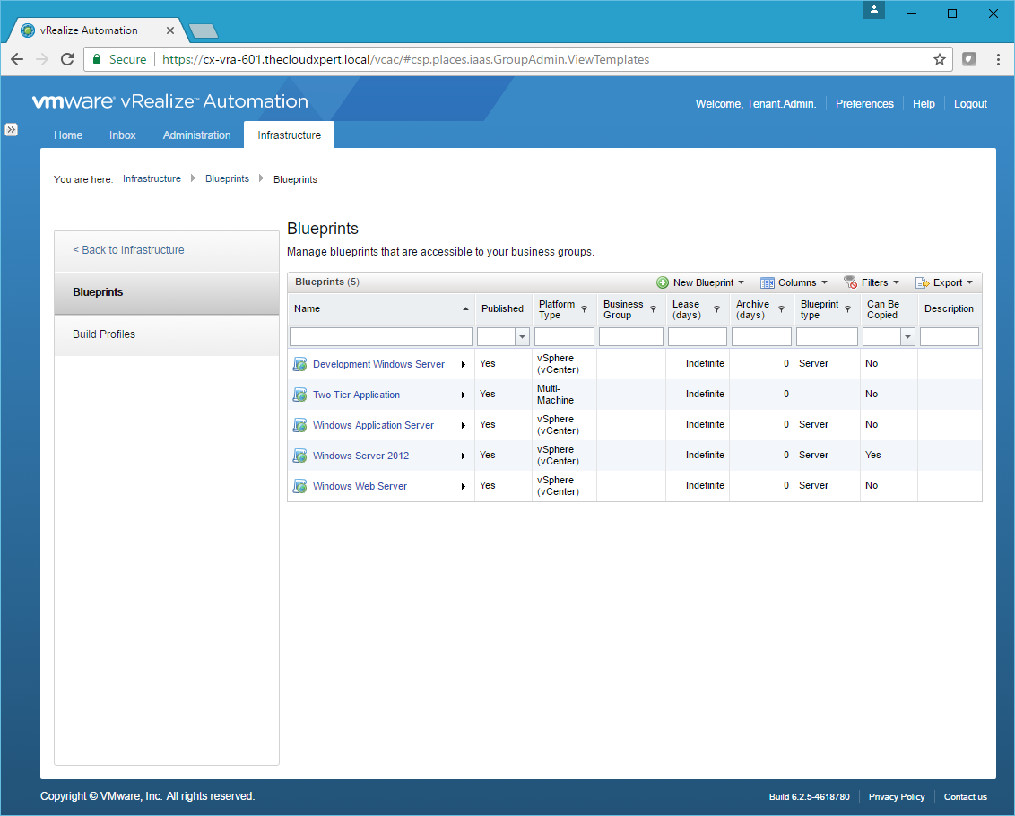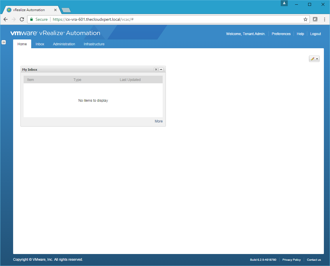 - Navigate to and log into the vRealize Automation Portal with a user that has Tenant Administrator (or Business Group Manager) role.
