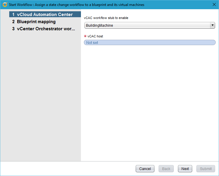 - Select the appropriate workflow stub from the vCAC workflow stub to enable dropdown and then click Not set.