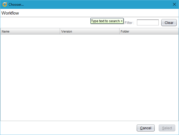 - Enter search criteria into the Filter textbox, press Enter, then highlight the workflow and click Select.