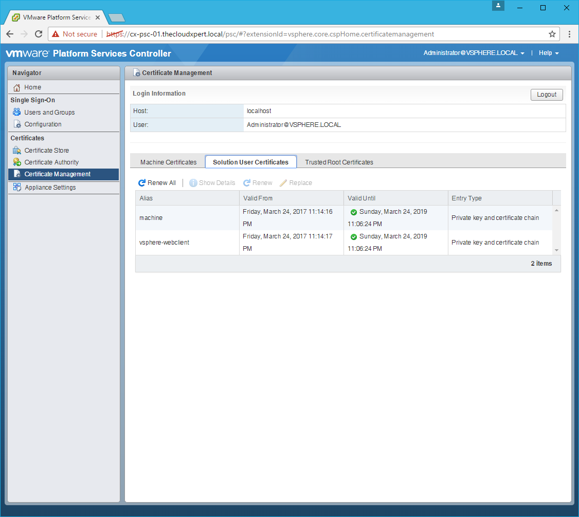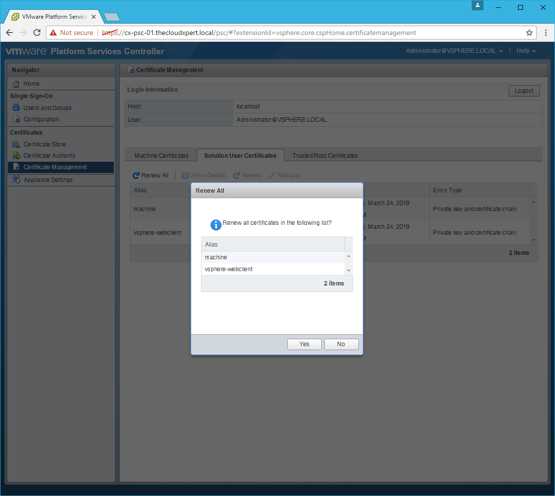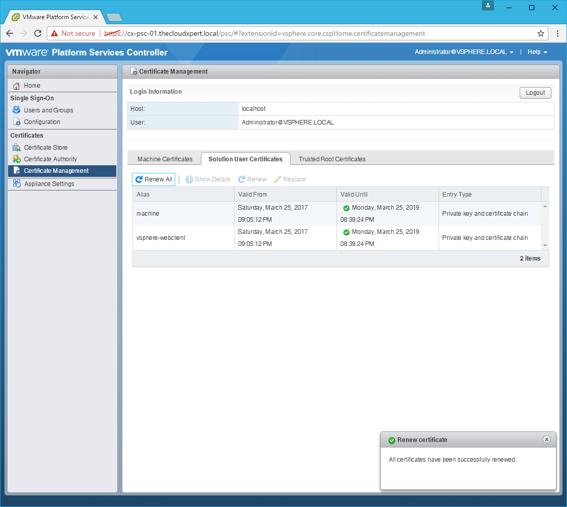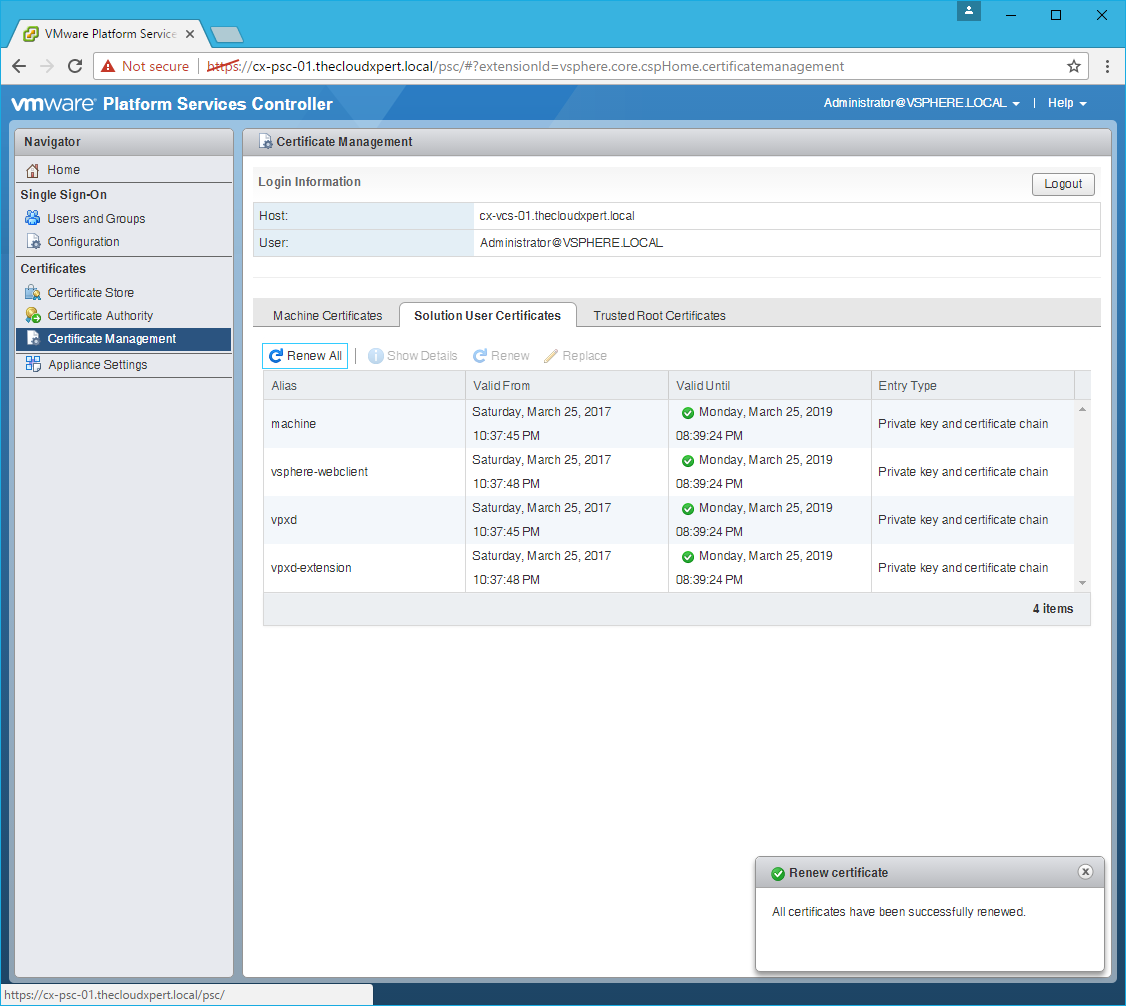 - Renew the Solution User Certificate.