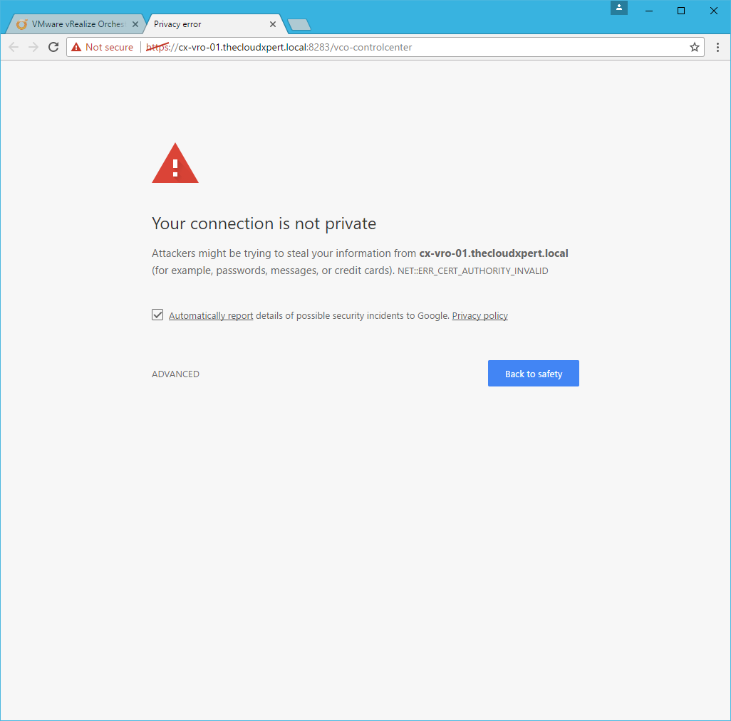 - Click Advanced and then click Proceed to vro.fqdn (unsafe).
