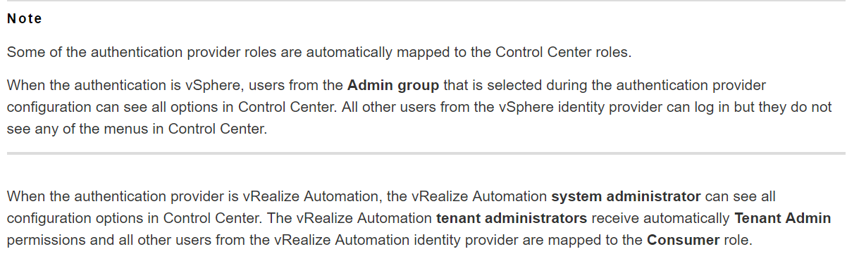 - Unless you used the the vsphere.local\Administrators group to be the Admin Group as part of the initial configuration for vSphere SSO. You would lose the ability to manage the initially log into Control Center resulting in a blank screen (see No Access under the Access Management Results below).