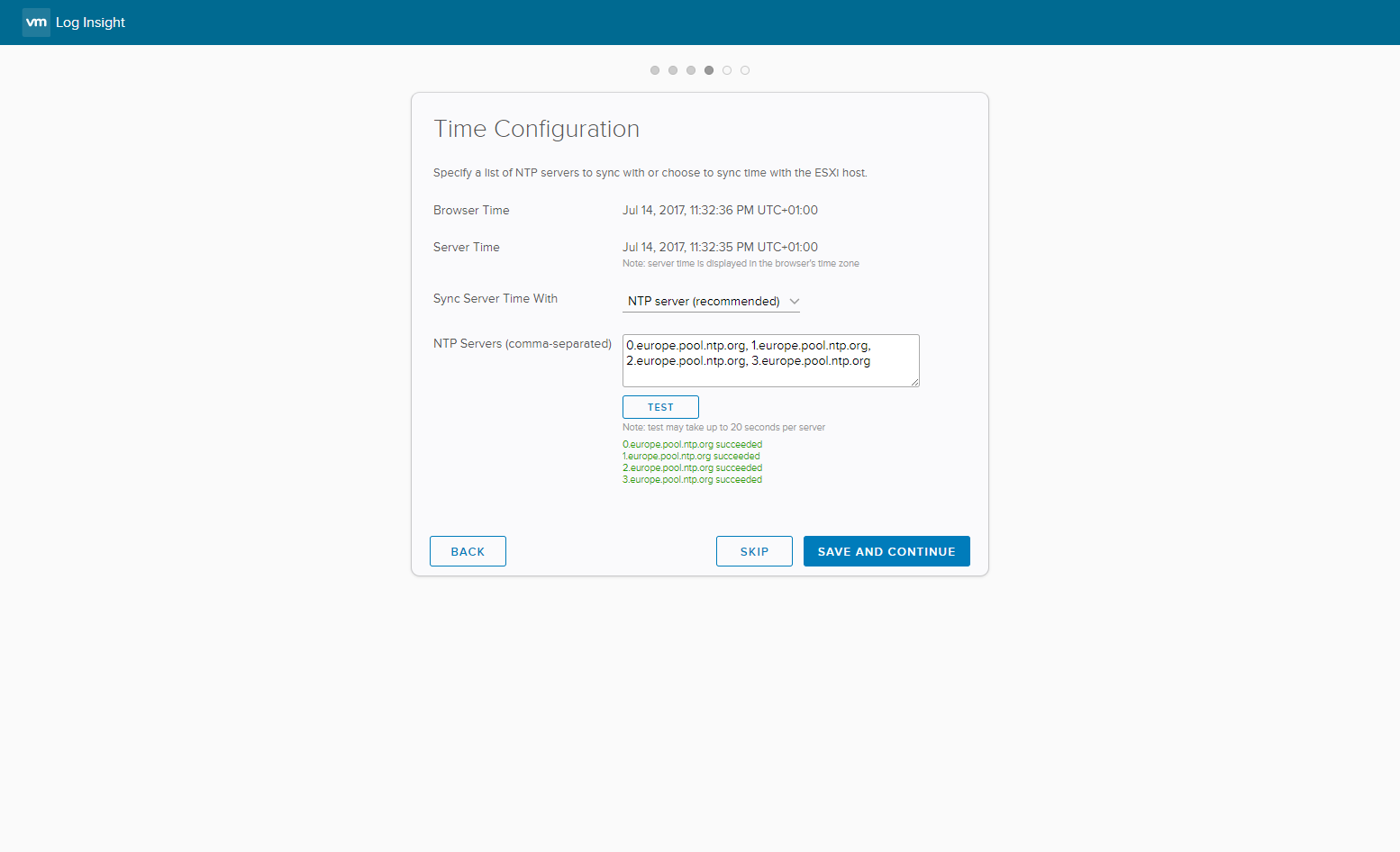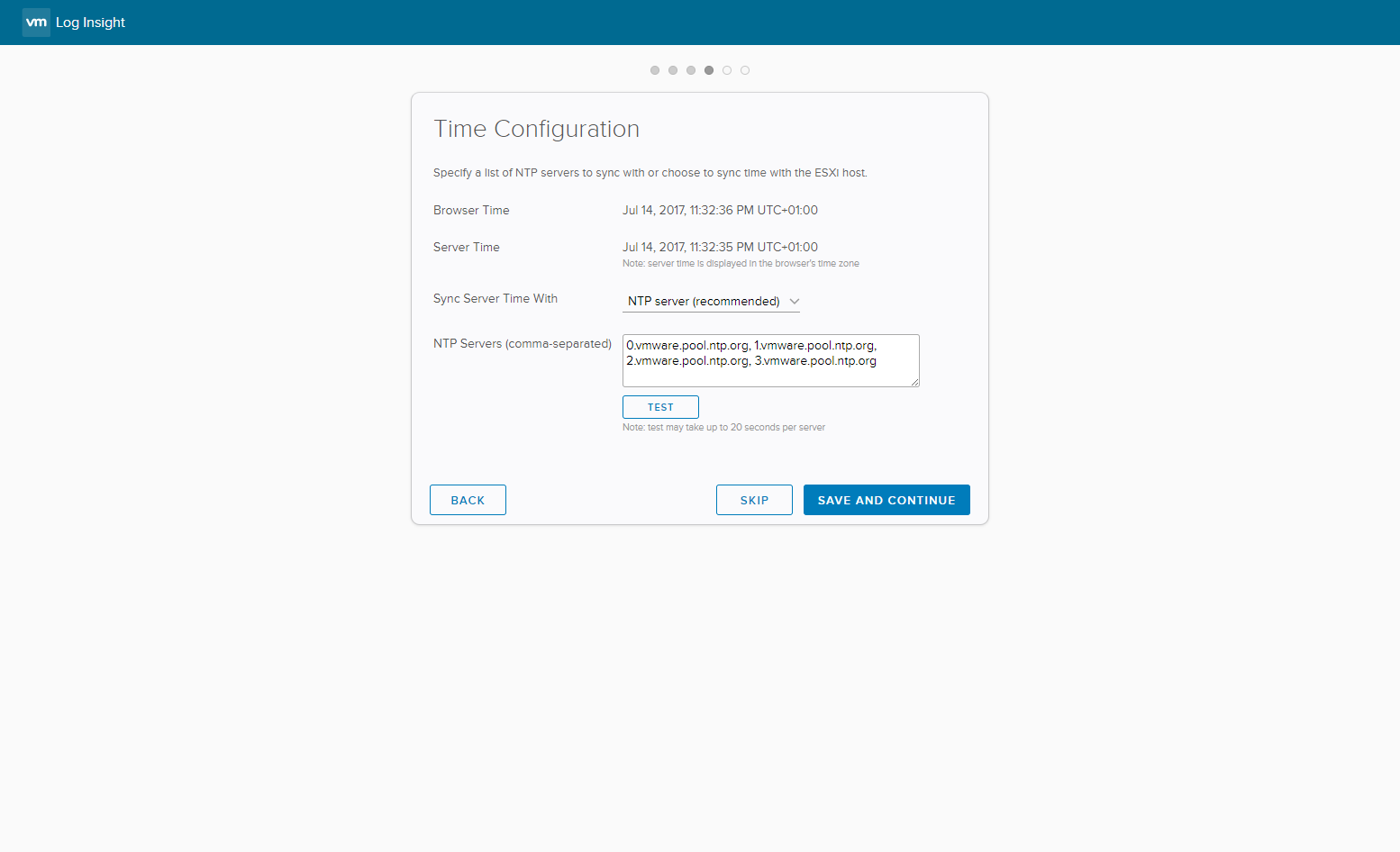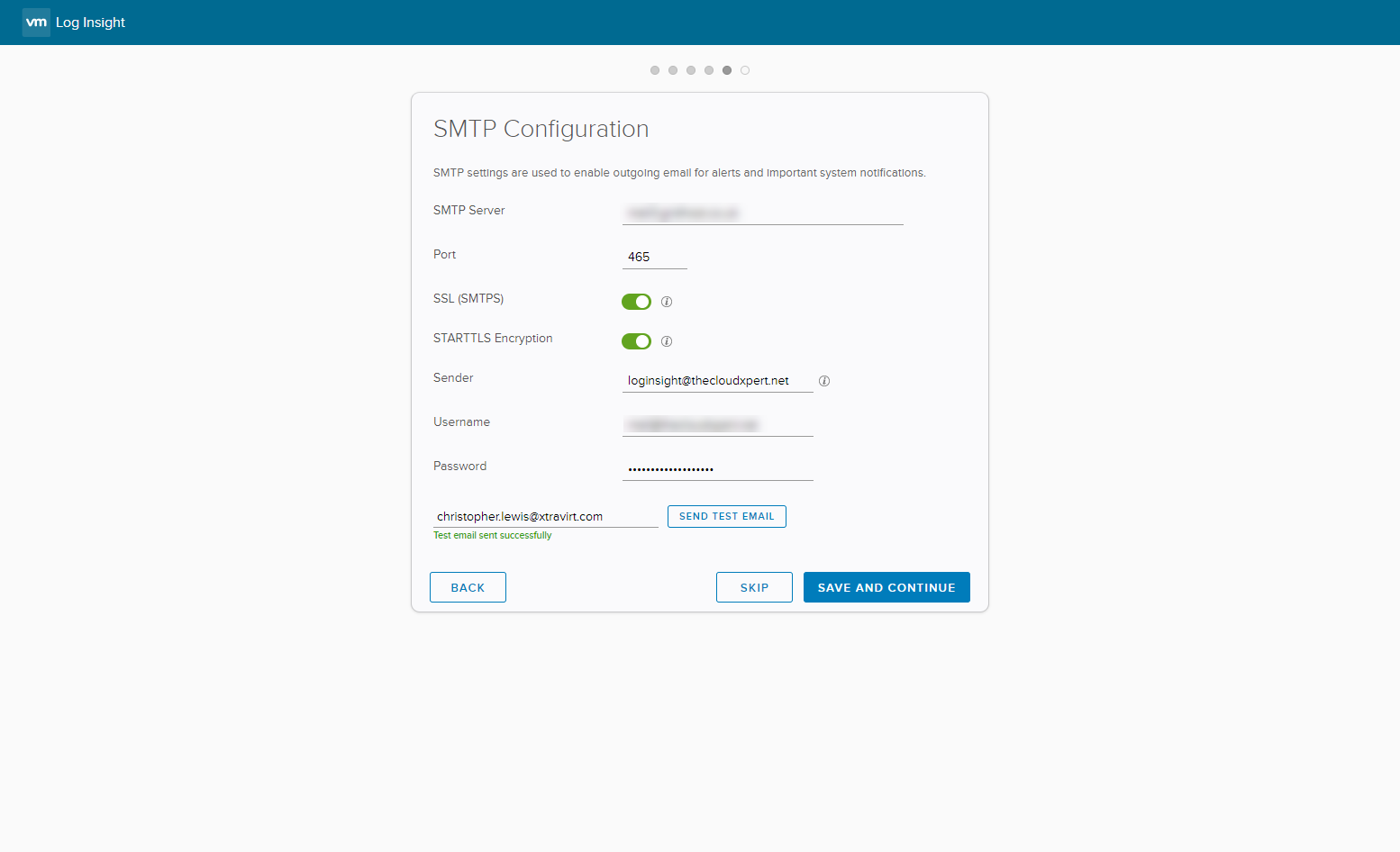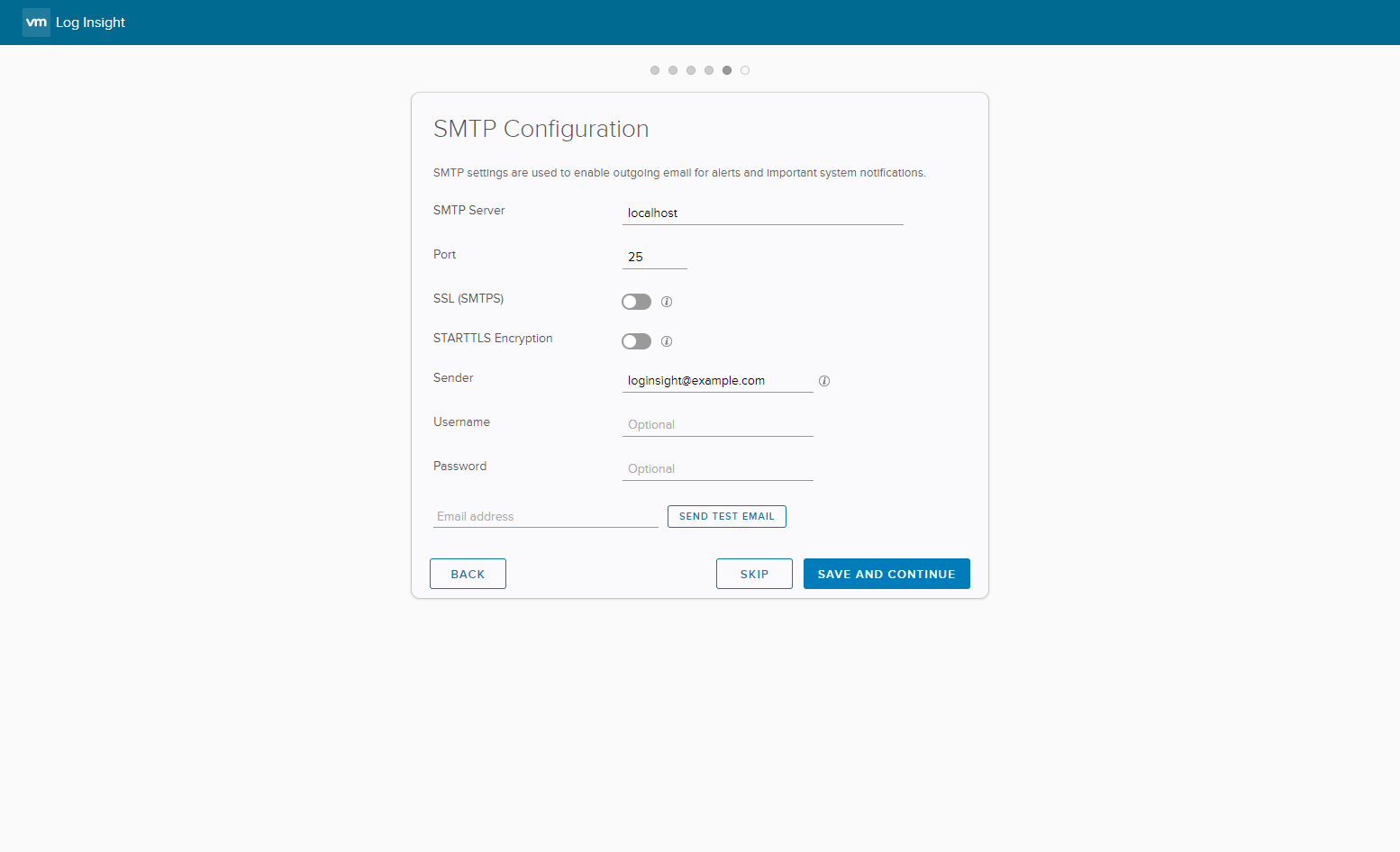 1. (if required) Update the SMTP Configuration so that notifications can be sent from vLI (or click Skip).