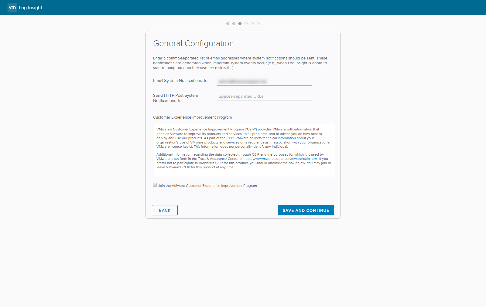 1. Type an Email Address into the Email System Notification To textfield and (optional) add the Send HTTPS Post Notification To URL. Then Uncheck the Join the VMware Customer Experience Program checkbox.