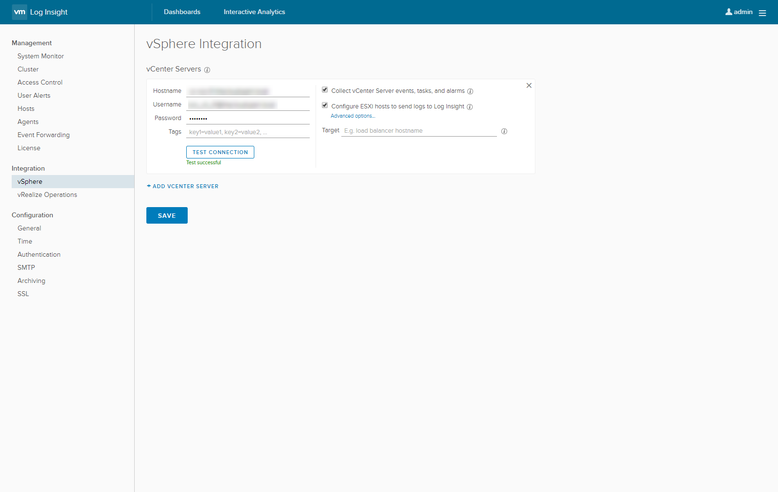 1. Type the Hostname (vcenter.fqdn), the Username, the Password. (optionally) Check the Connect vCenter Server events, tasks and alarms checkbox. (optionally) Check the Configure ESXi hosts to send logs to Log Insight checkbox. Click Test Connection.