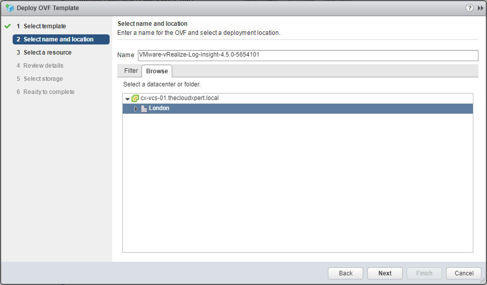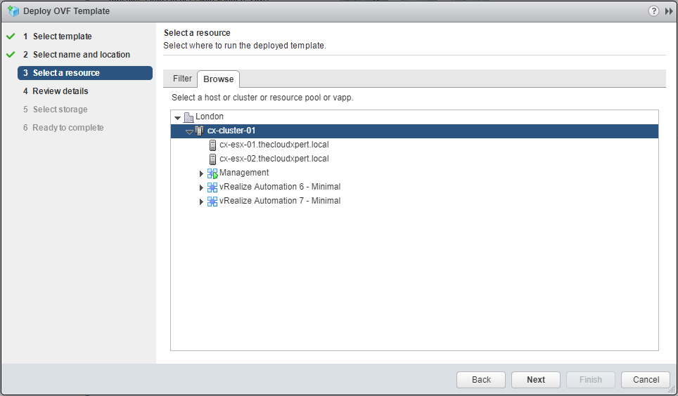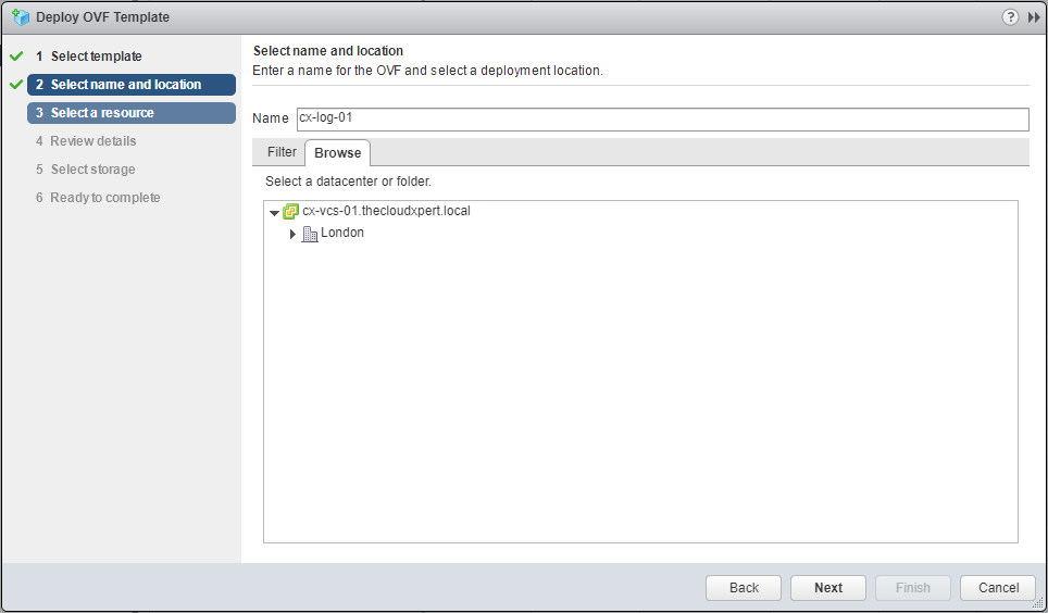 1. Select the Resource (cluster, host or vApp) where you want to deploy vLI and click Next.