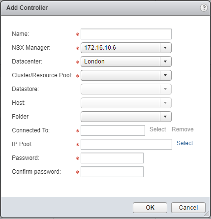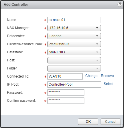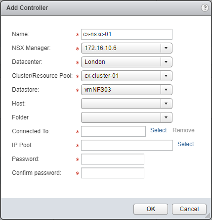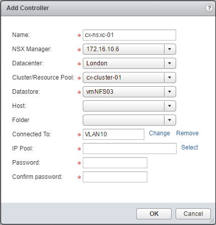 - Type the name of the new NSX Controller, select the appropriate NSX Manager, the appropriate vCenter DataCenter, and the Cluster/Resource Pool to deploy the NSX Controller too.