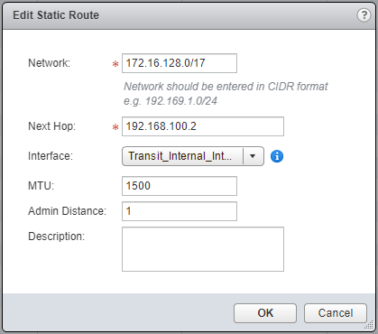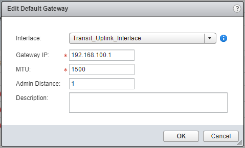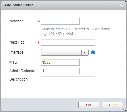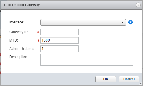 - Select the Interface from the dropdown, enter the Gateway IP address, (optional) update the MTU value and Admin Distance.