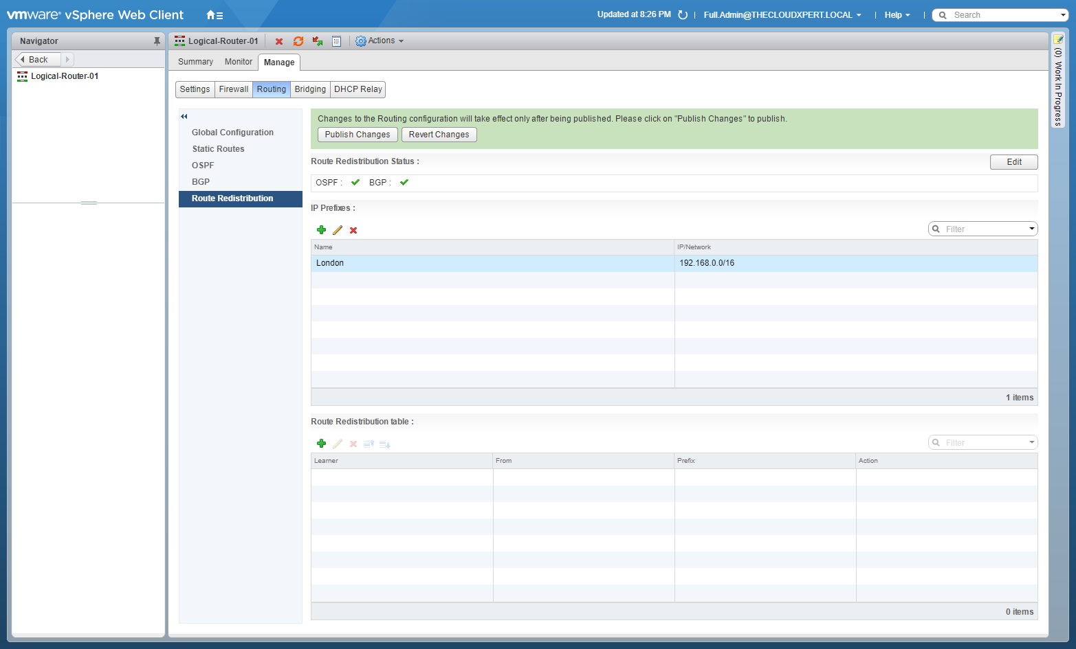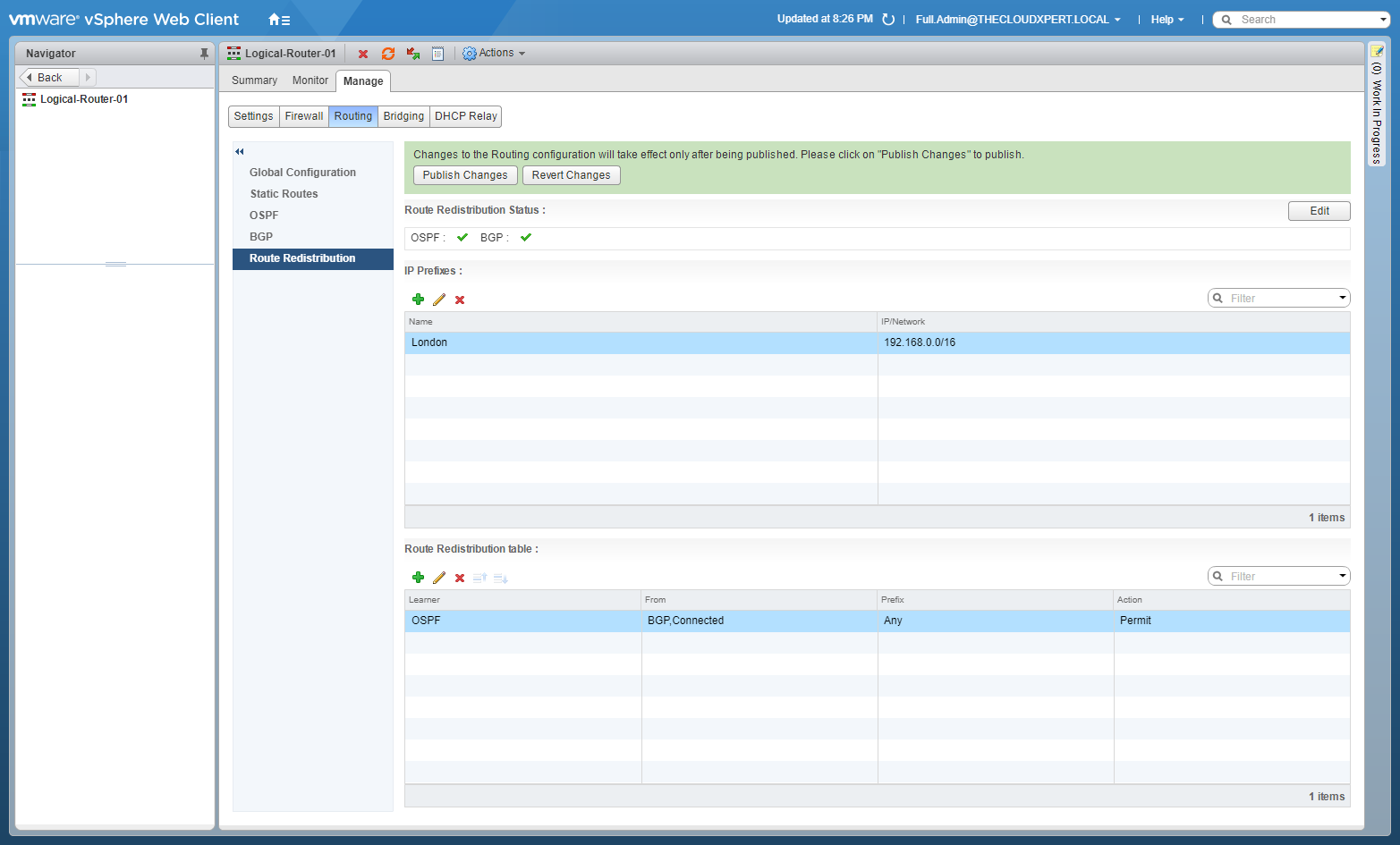 - Select the Manage tab, select Routing and then select Route Redistribution.