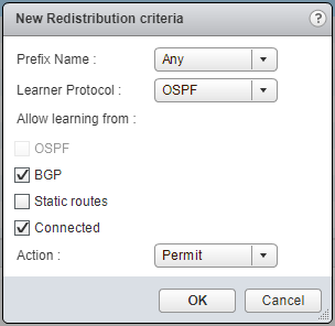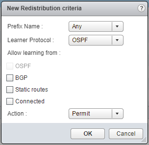 - Select the Prefix Name (Any), the Learner Protocol (OSPF/BGP), check the appropriate Allow Learning from checkboxes and select Permit from the Action dropdown.