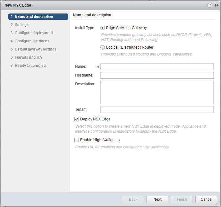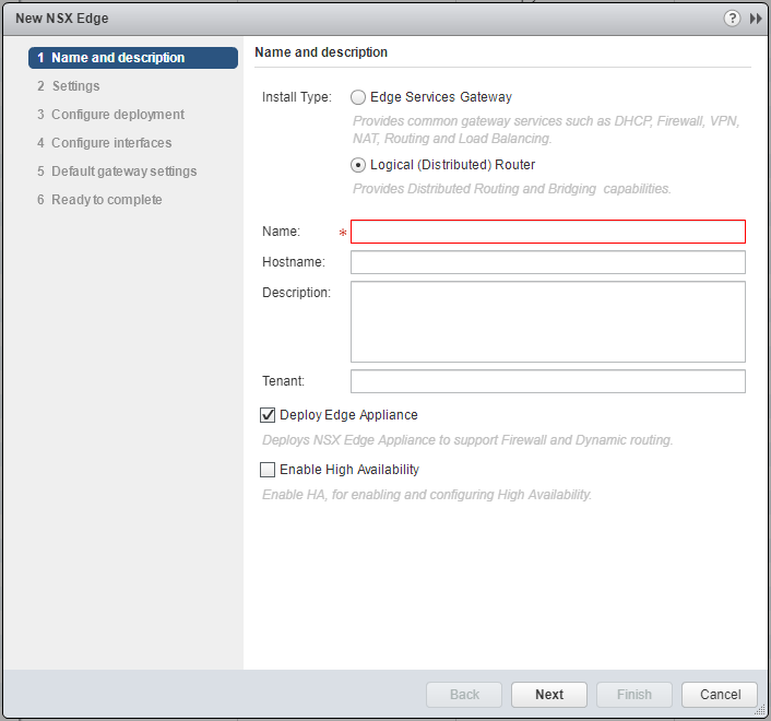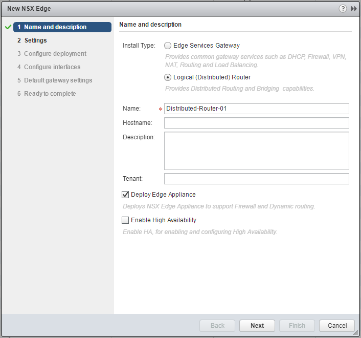 - Type the Name of the new Logical Router, (optionally) type a Hostname, Description and Tenant. (Optionally) choose whether to check/uncheck the Deploy Edge Appliance and Enable High Availability checkboxes.