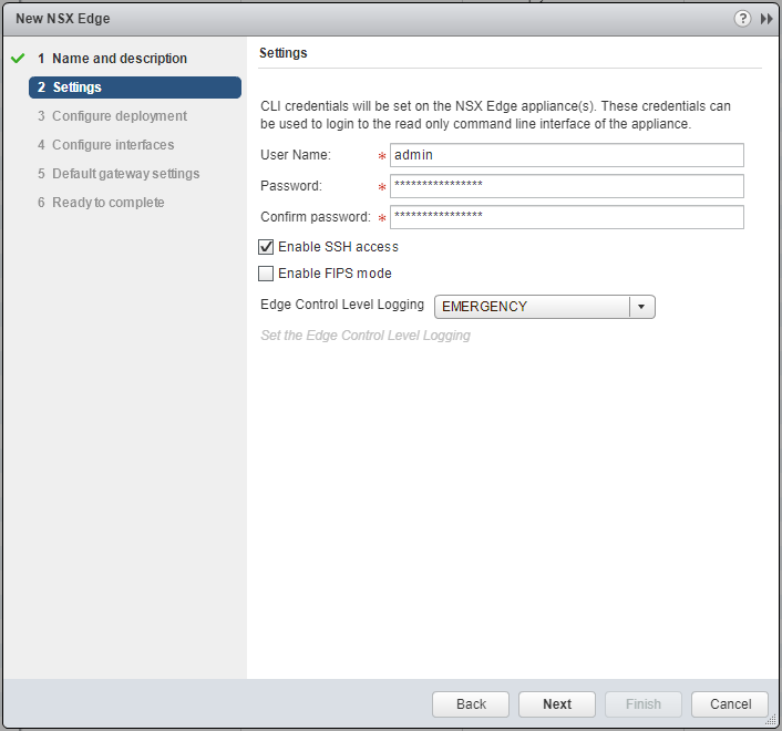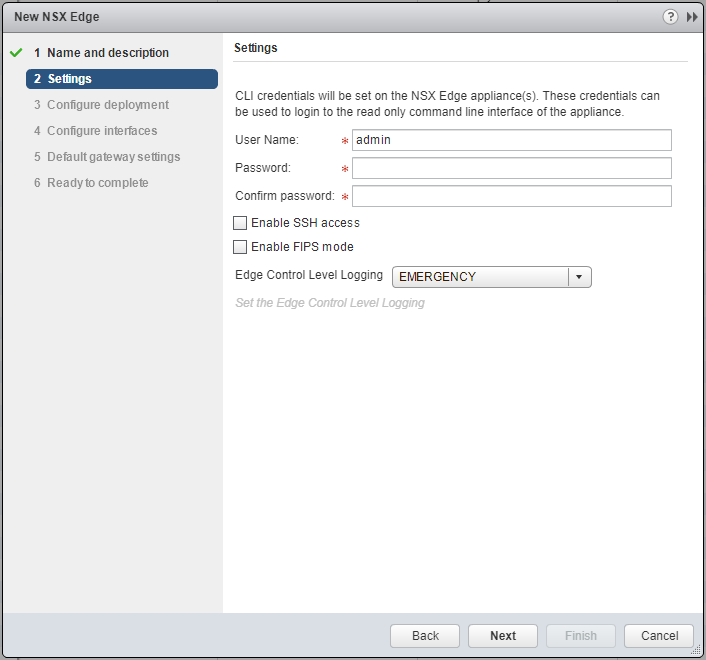 - Type and confirm a Password for the CLI credentials. (Optional) check the Enable SSH access or Enable FIPS mode checkboxes based on your requirements.