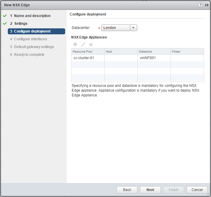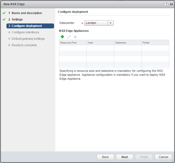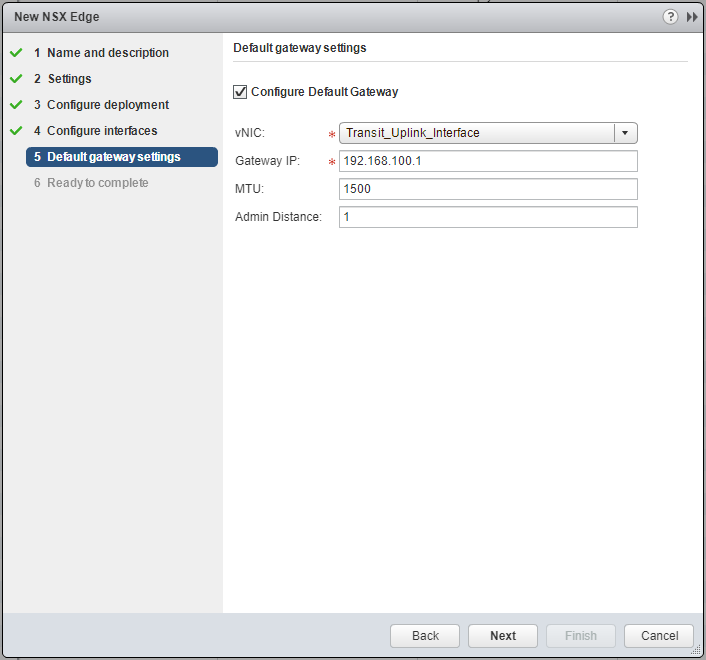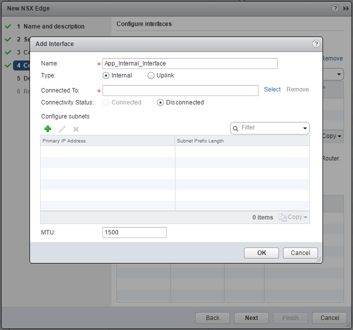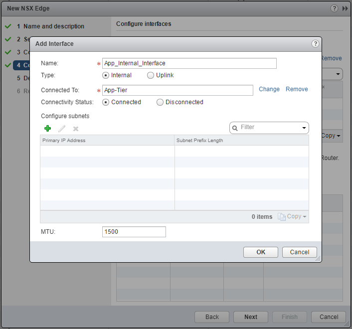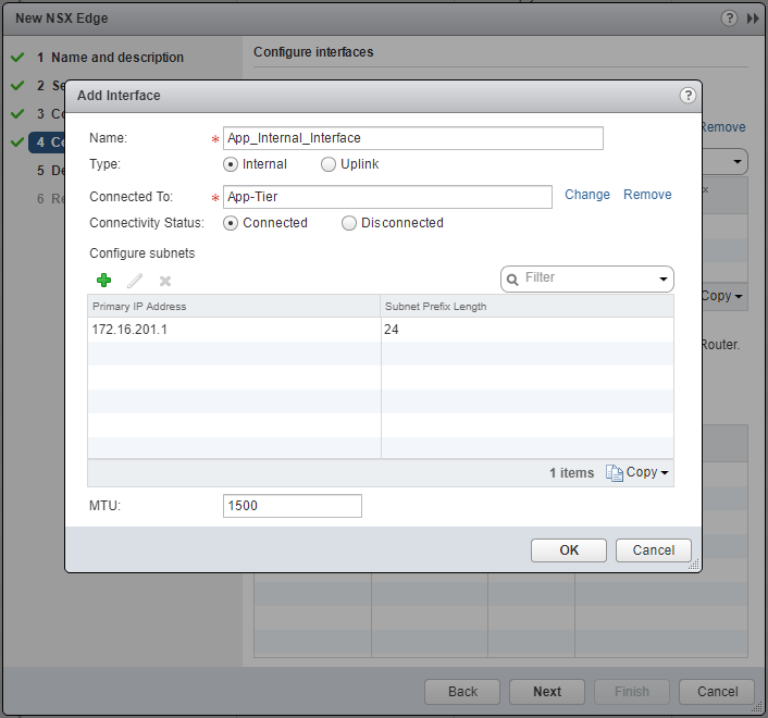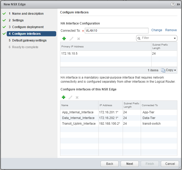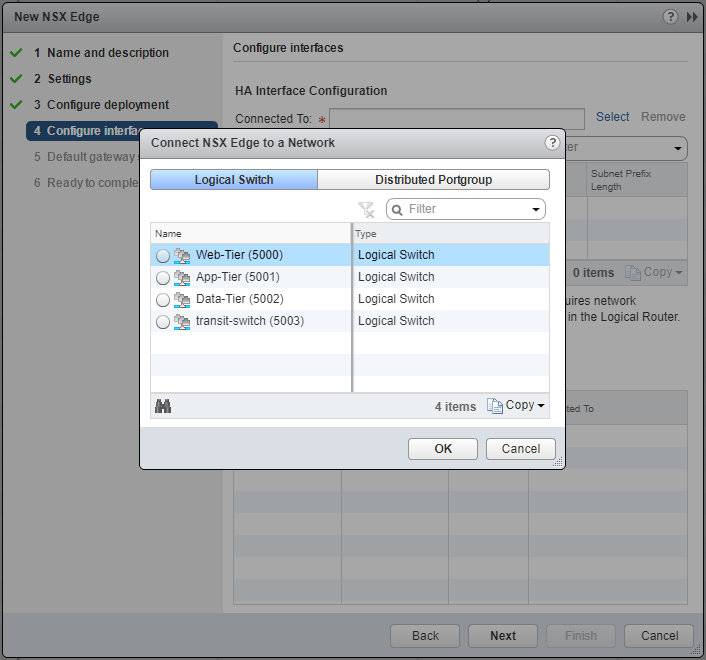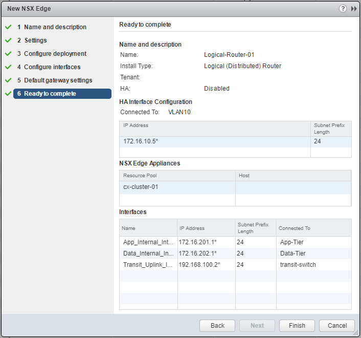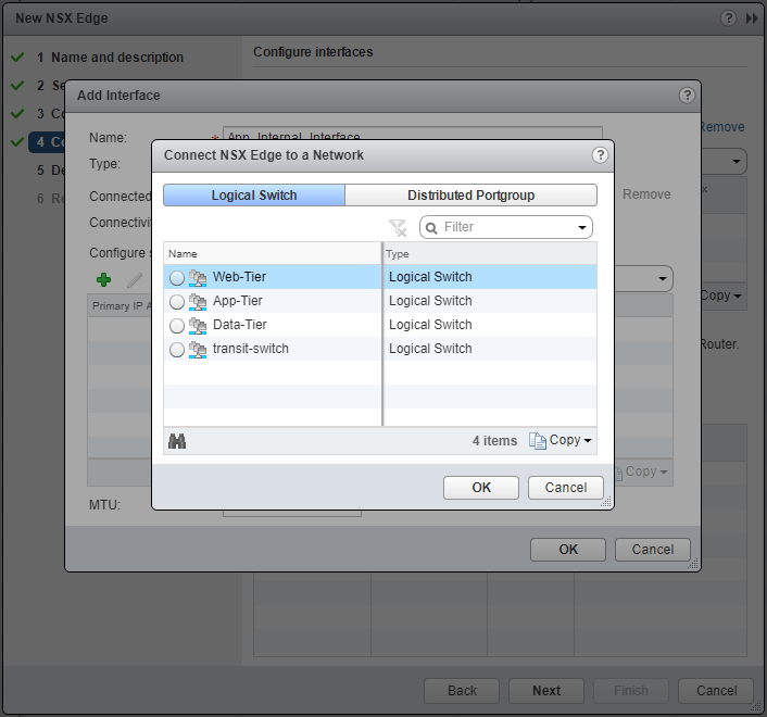 In this example, we will create a new DLR with two Internal interfaces to connect the App_Tier and Data_Tier Logical Switches. Finally we’ll add an Uplink interface to connect the DLR to a “transit” logical switch.