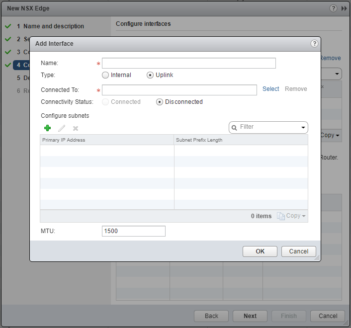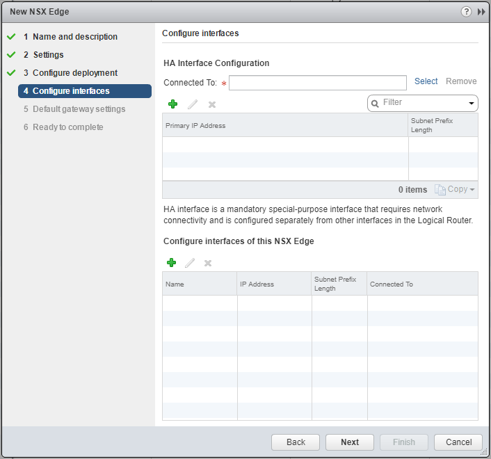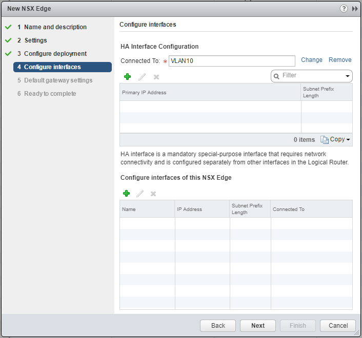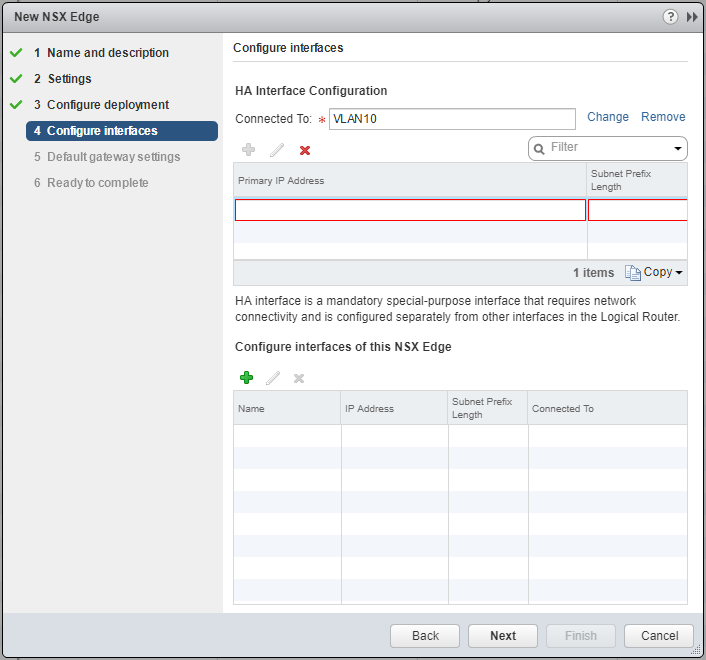 - Under Configure interfaces of this NSX Edge, click Add(+).
