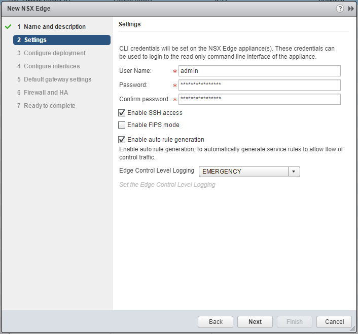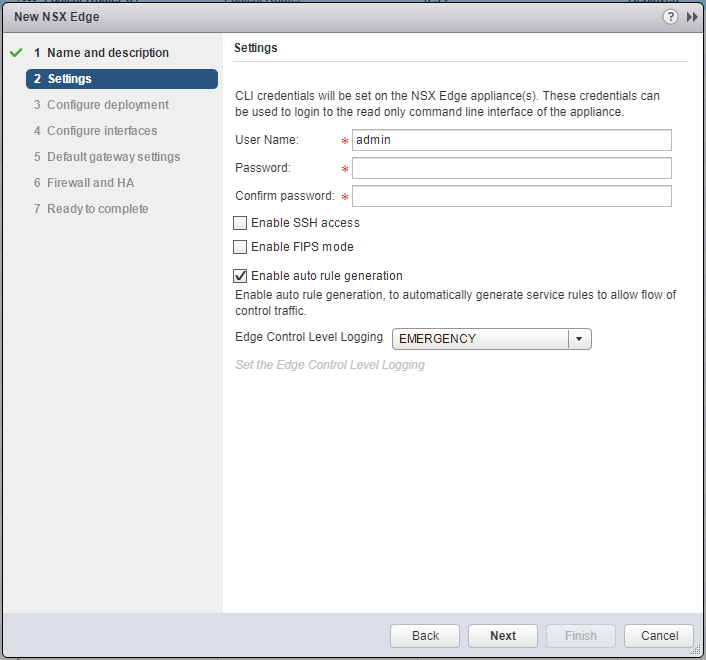 - Type and confirm a Password for the CLI credentials. (Optional) check the Enable SSH access or Enable FIPS mode checkboxes based on your requirements.