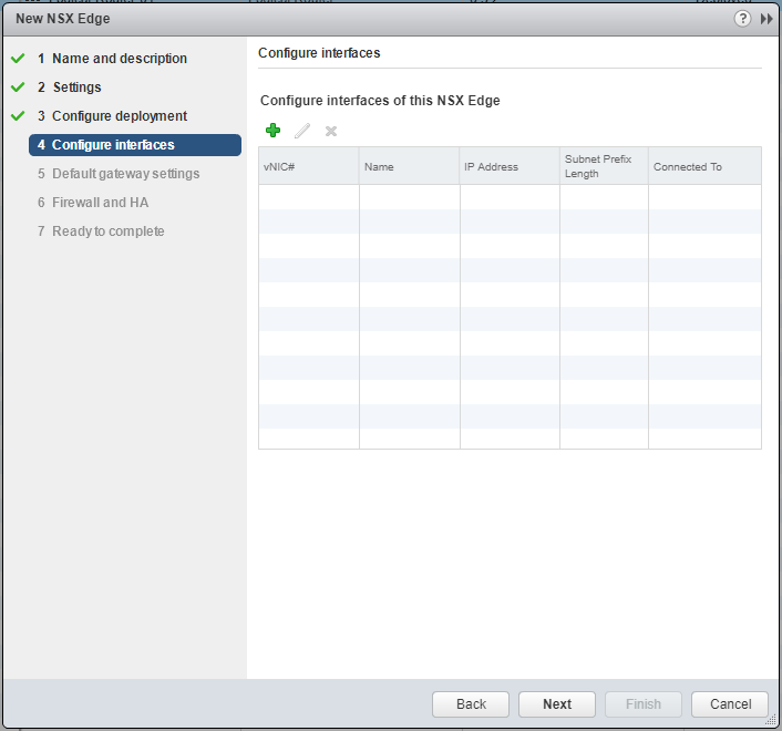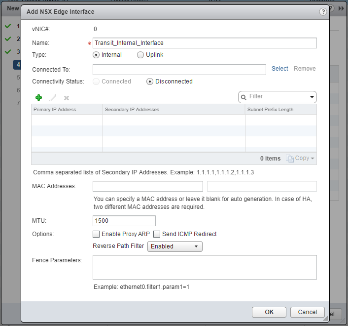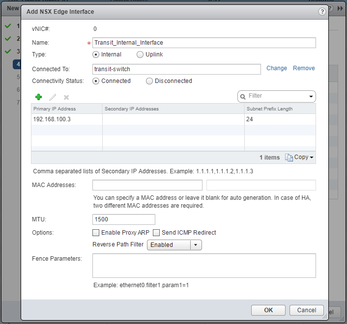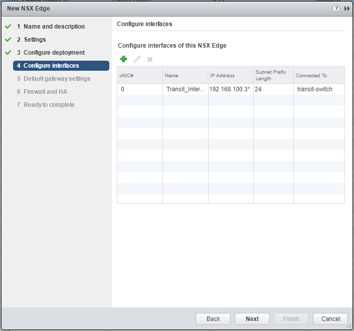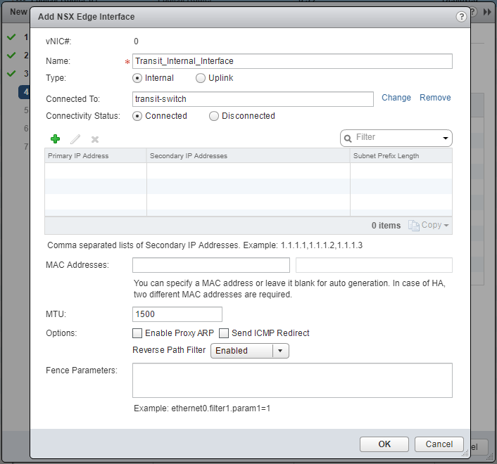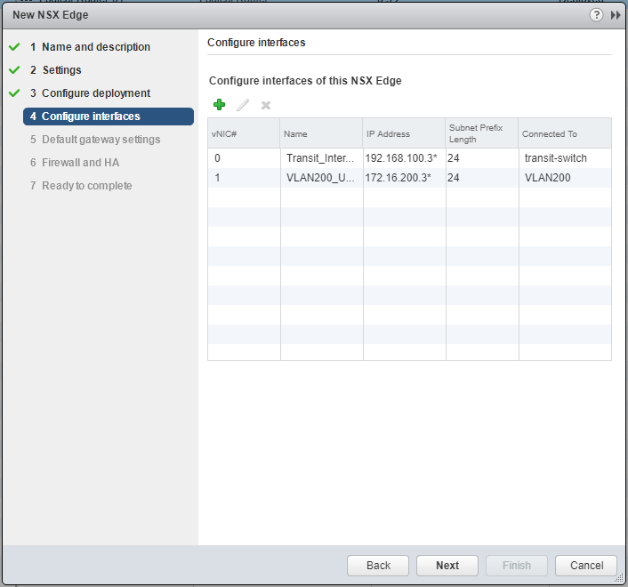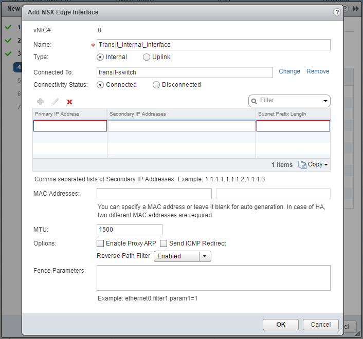 In this example, we will create a new ESG with two interfaces, one to connect to the transit network (Internal) and one to connect to a vDS Port Group (Uplink).