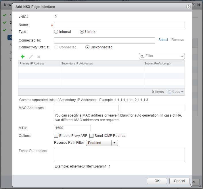 - Type the Name of the NSX Edge Interface, select the appropriate Type option (either Internal or Uplink).