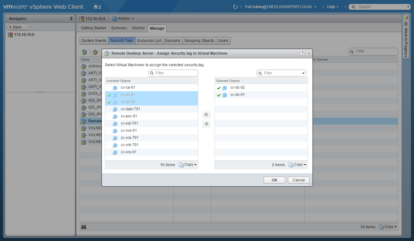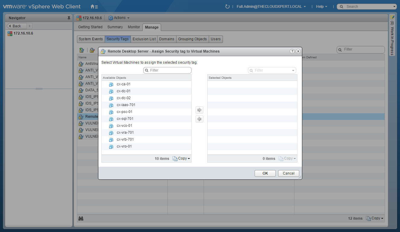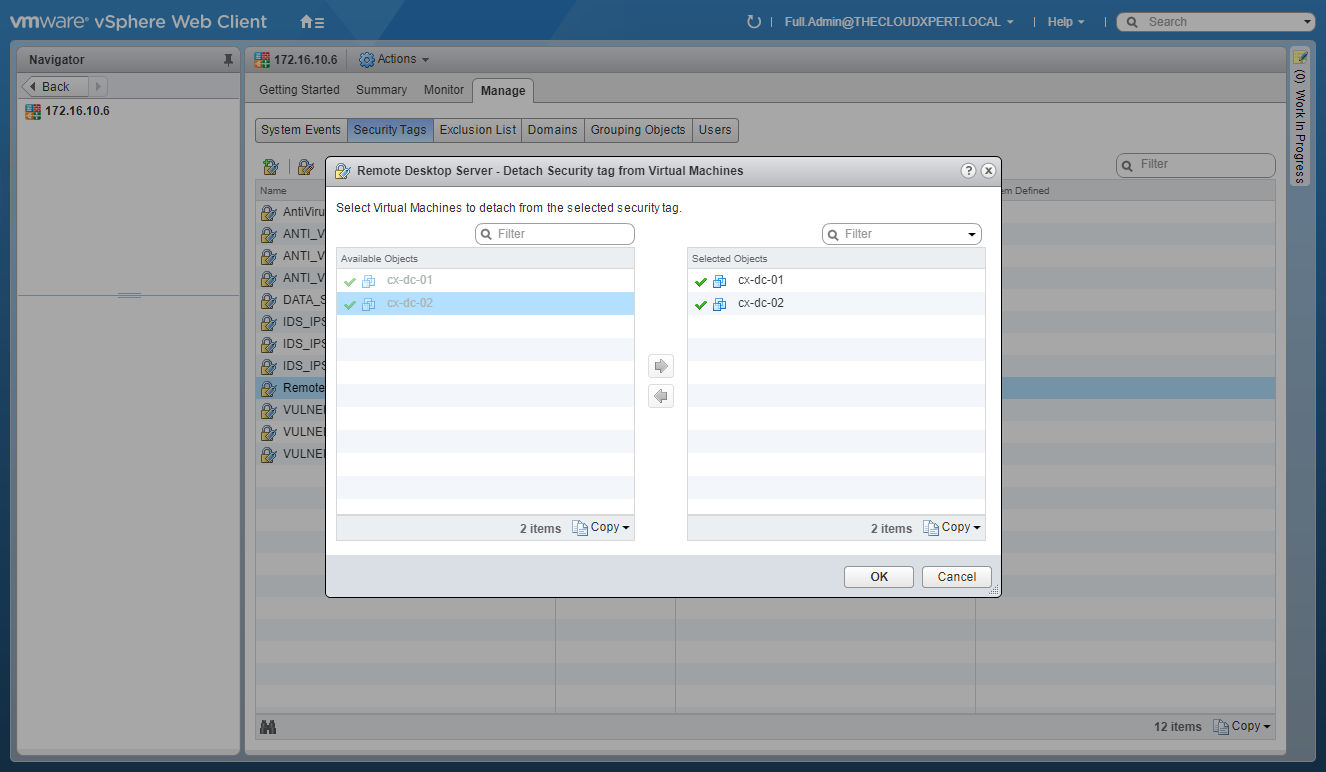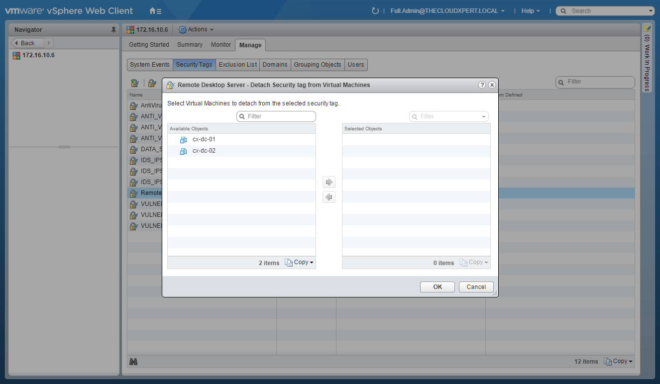 - Select the Available Objects that need to be detached from the Security Tags and click the arrow to move them to the Selected Objects list.