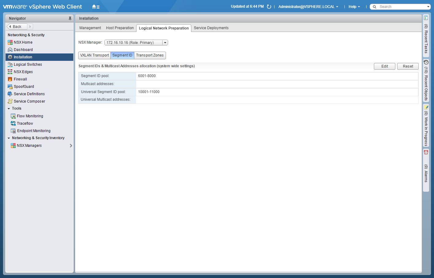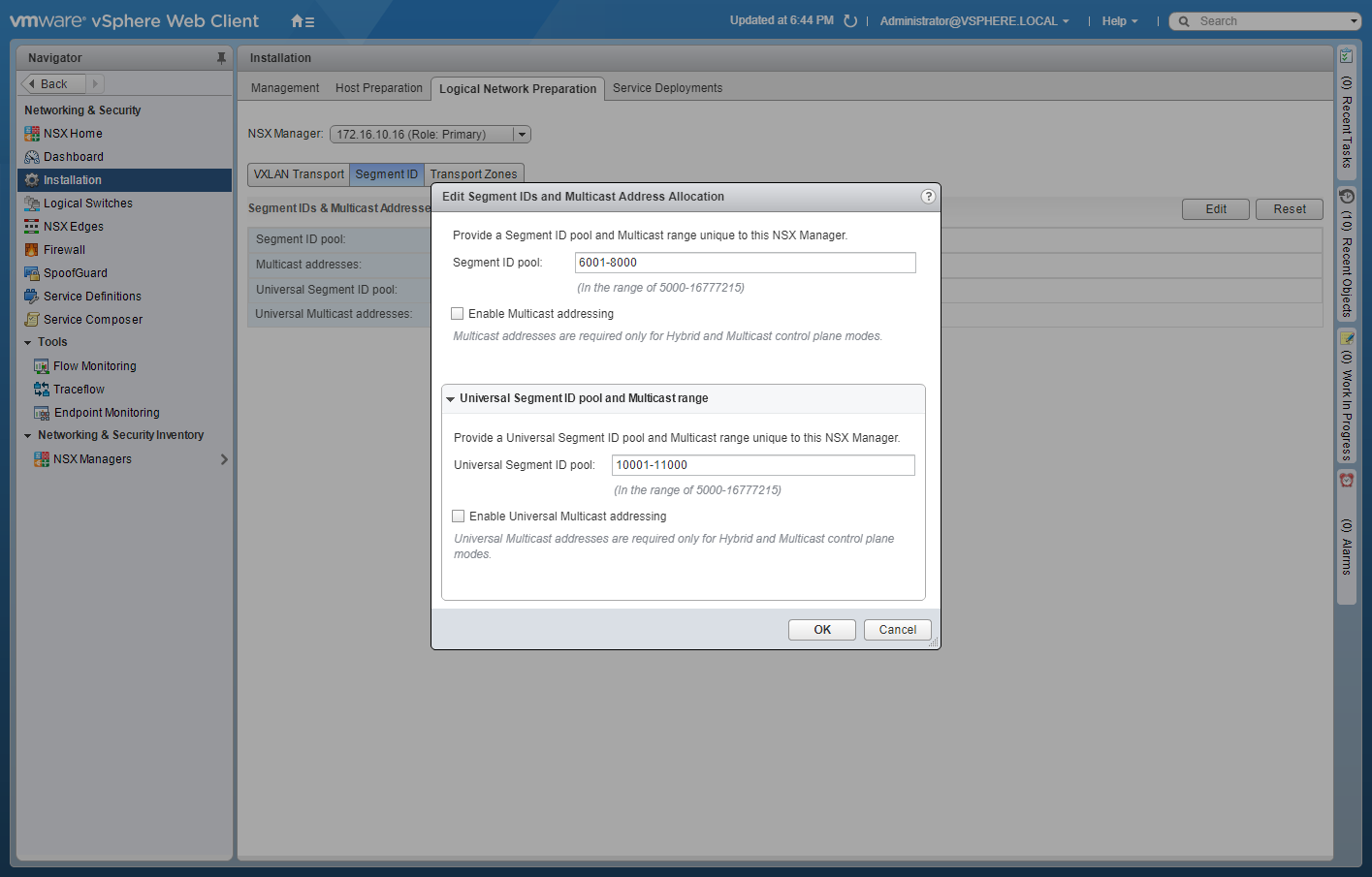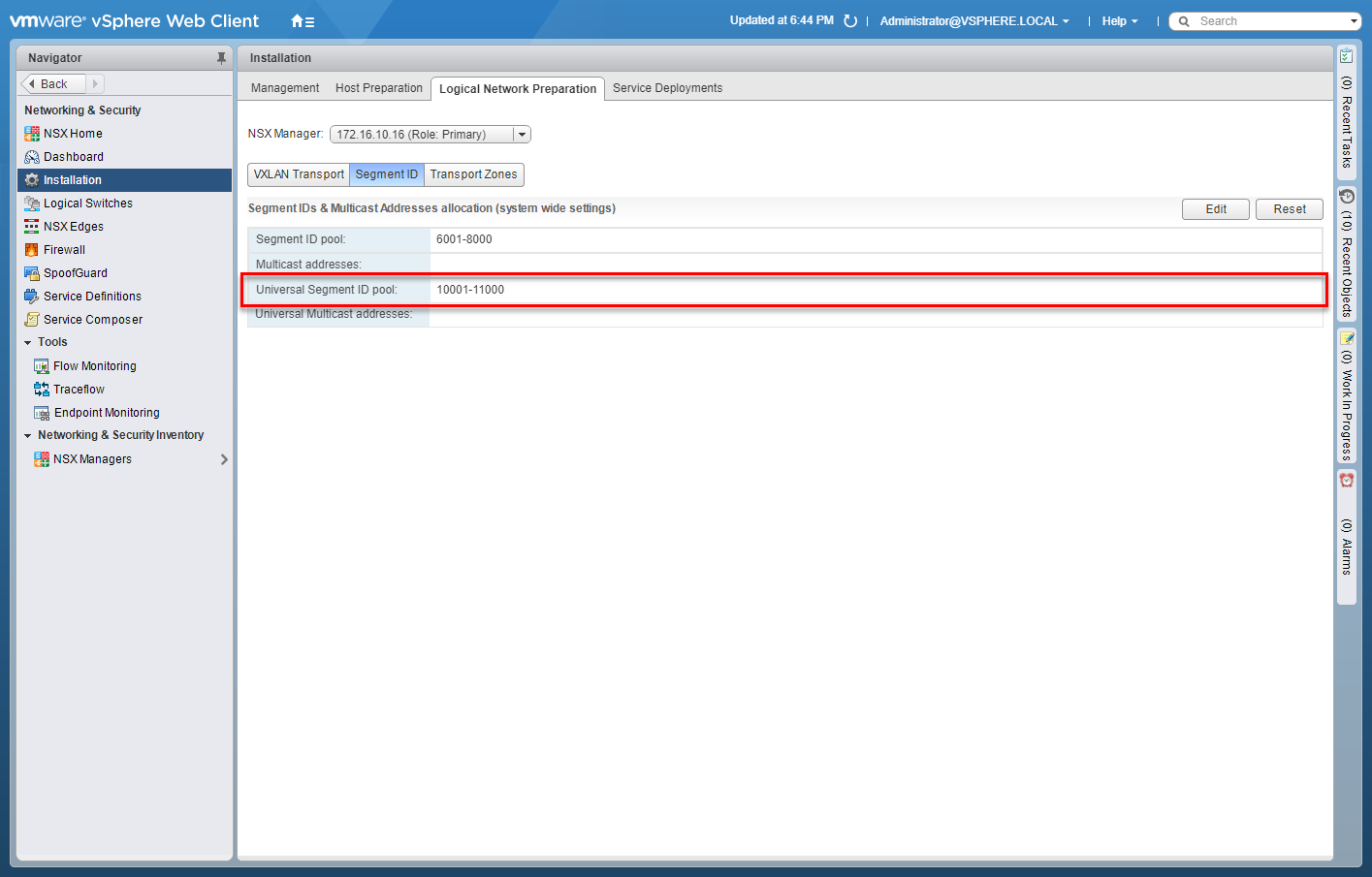 - Select the Primary from the NSX Manager dropdown and click Segment ID.